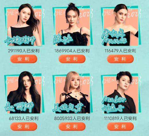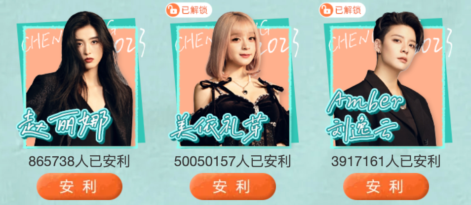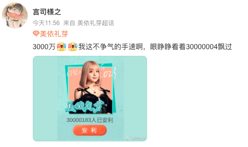 在美依礼芽人气突破3000万的时候,原本一直霸榜第一的谢娜票数800万,另一位人气姐姐ELLA票数为400万+,这样的断崖式票数,就连在当年偶像选秀决赛夜也很难见到。