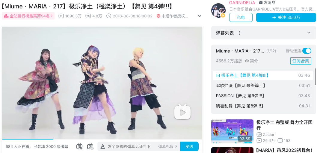 《极乐净土》在B站 GARNiDELiA官方账号,单个视频,播放量就累积到了1690万,专题中的12个视频总播放量超过4500万。