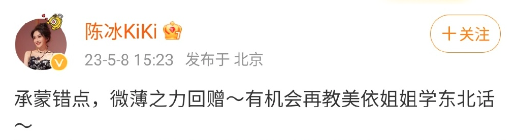 陈冰姐姐知道后,赶紧用自己的账号给小美回投,并表示会多多教她东北话: