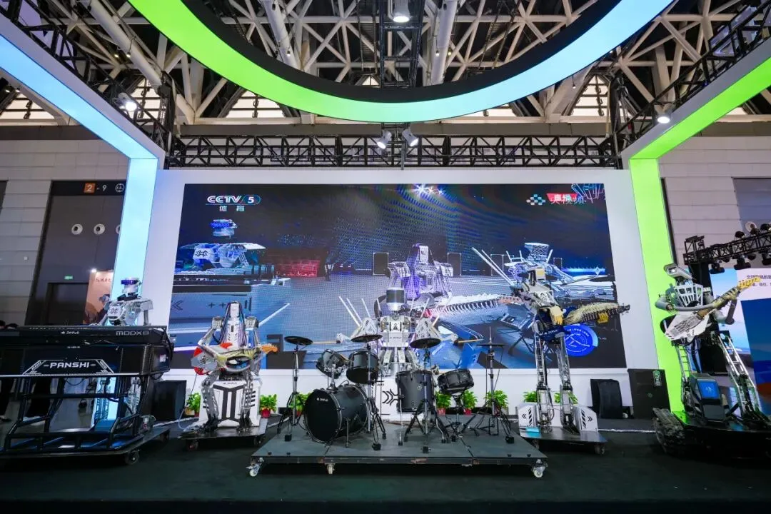 在磐石科技展台,一支由机器人组成的乐队正在激情“开演”,不少观众纷纷拿起手机、相机拍照打卡。一位身着红色夹克的游客感叹道:“现在的机器人真是越来越厉害了,看看这表演氛围感拉满,一点都不输真人演出。”