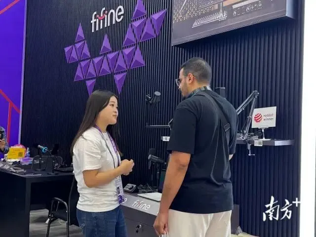 “我们公司做了近十年,一直坚持做自己的品牌出海。”骏锋电子销售主管林馥瑜说。她身后的展位上,紫黑色调的酷炫设计,搭配着旗下自主品牌“Fifine”的全系新品,吸引了络绎不绝的境外采购商驻足体验。