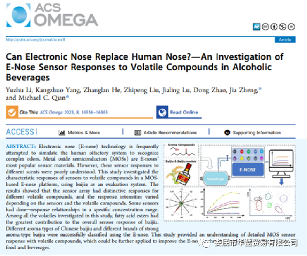 近日,五粮液风味研究团队在美国化学会主办的知名期刊《ACS Omega》以封面文章的形式发表了研究文章《Can electronic nose replace human nose?-An investigation of Enose sensor responses to volatile compounds in alcoholic beverages“电子鼻能代替人类的鼻子吗?关于电子鼻传感器对酒精性饮料中挥发性成分响应的研究”》。(原文链接点击文末阅读原文查看)