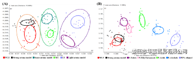 图4 不同香型白酒及模型白酒的差异分析
