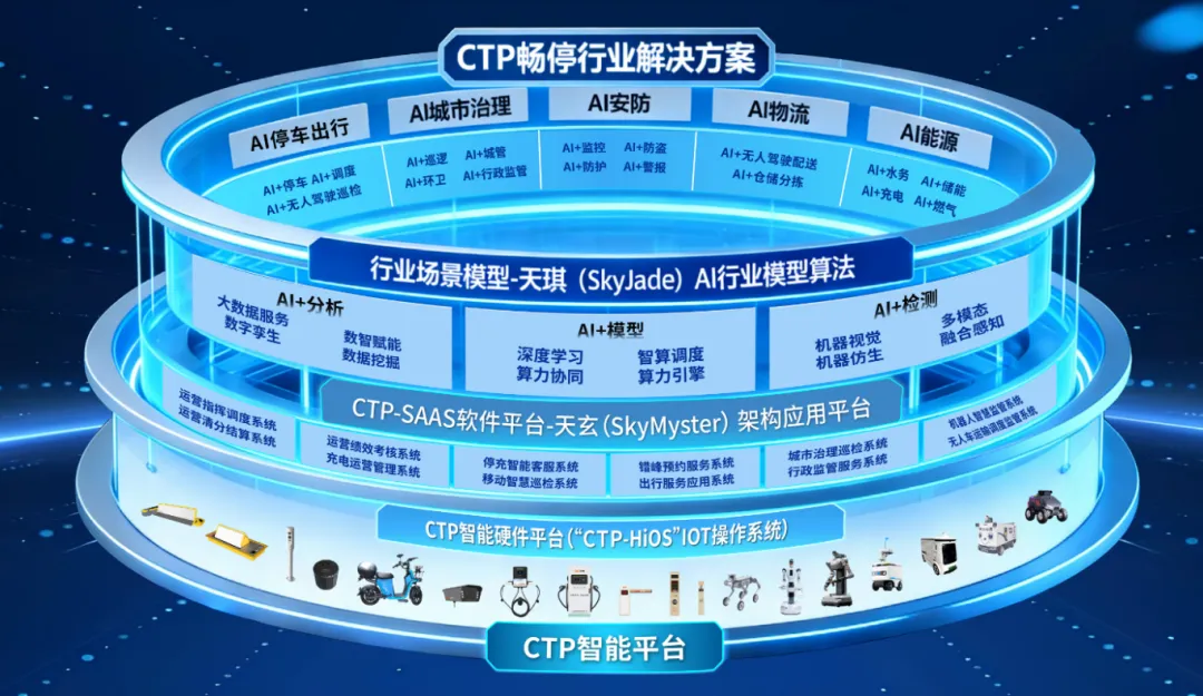 CTP通过AI赋能,聚焦AI停车出行、AI城市治理、AI物流、AI能源、AI安防等核心领域,基于自主研发的“天琪(Skyjade)AI行业模型算法”、“天玄(Skymyster)底层架构平台”,以及搭载“CTP-HiOS”IOT操作系统的机器人、无人驾驶、无人机、停车设备、计量设备、充电桩等物联网智能硬件,为政府、企业及公众提供全场景、全周期“端-边-云”协同的AI数智化解决方案。