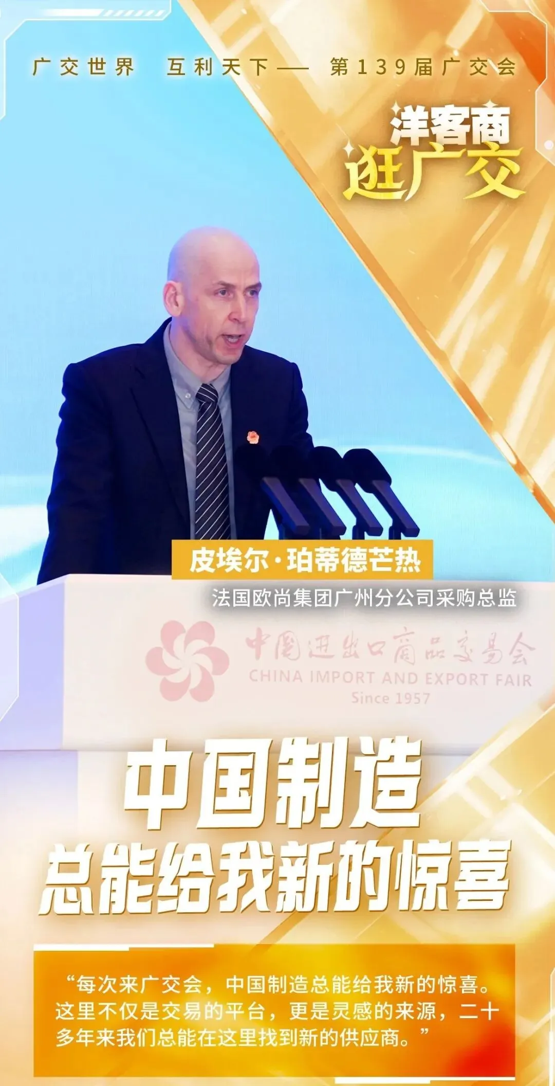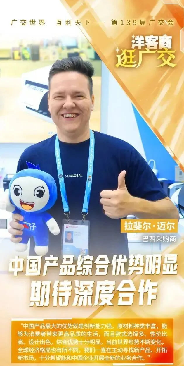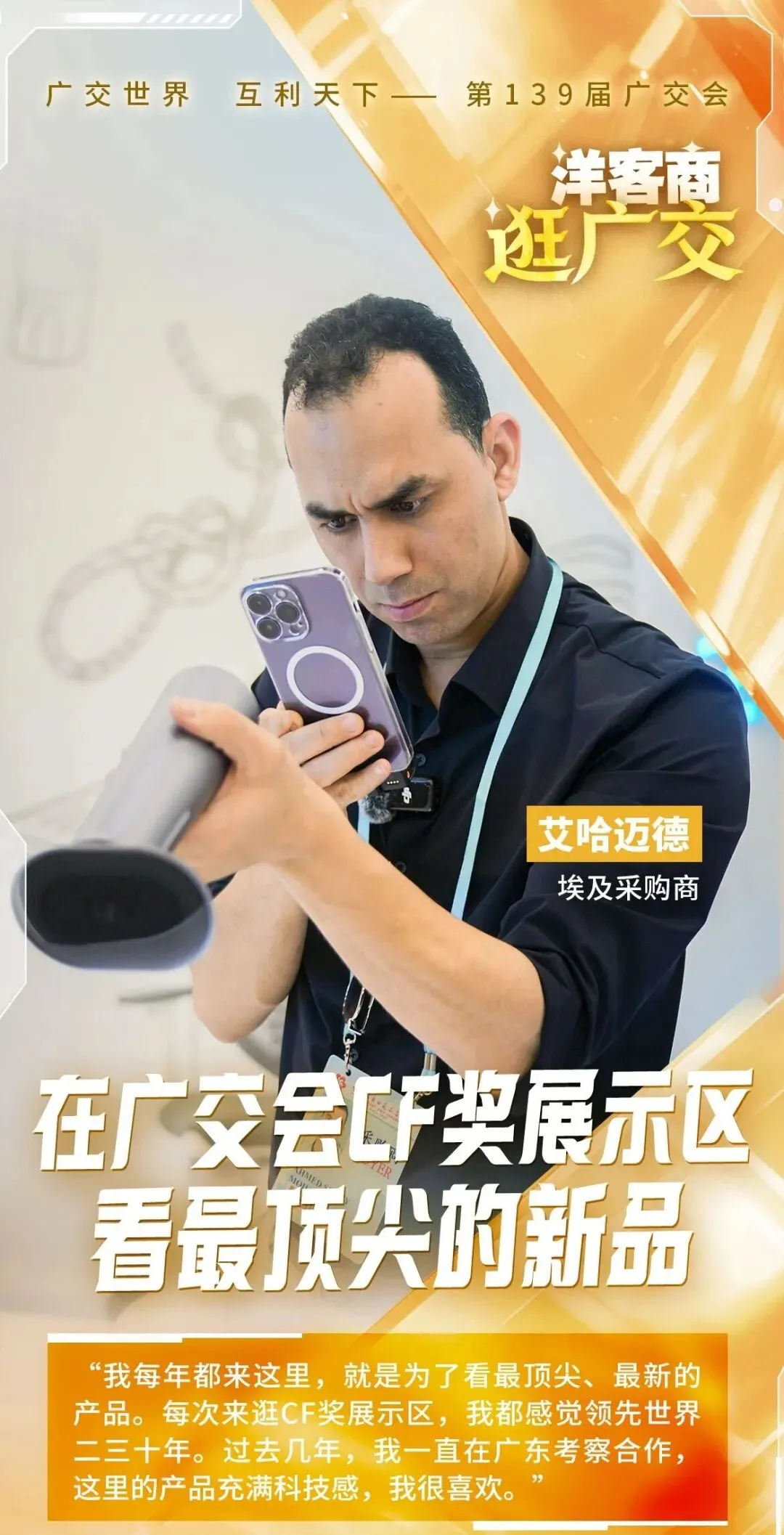“中国总是有非常先进的技术。比如我现在试戴的这副眼镜——真的很先进,又轻,功能又很多。每次来广交会,我都很开心能发现像这样的产品。我觉得中国能把新技术迅速地转化为展品和商品,这对世界的多元化发展是非常大的助力,”摩洛哥采购商希姆迪说。当摩洛哥采购商希姆迪戴着中国的翻译眼镜,笑着说出自己对中国智造的钦佩时,她其实也道出了广交会的宗旨 : 广交世界,互利天下。