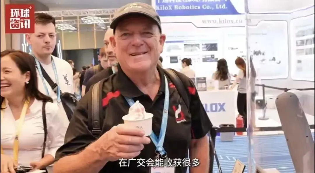 在另一侧,“外骨骼”的可穿戴设备吸引了不少采购商驻足。它像一副金属骨架,绑在人的腰部和腿部,能感应人体动作并主动提供助力。穿上它,普通人搬重物不伤腰,老人走路更省力,甚至瘫痪患者都有可能重新站起来。澳大利亚采购商布赖恩·霍伊把这套设备绑在自己腿上,一边走着一边和记者聊着他的惊喜。“我觉得中国人在创新方面非常厉害。从电子产品到汽车,几乎所有电子类产品,都在引领市场。这太棒了,我很喜欢来这里。如果你想找创新的科技产品,广交会绝对是首选,我向所有人强烈推荐,”布赖恩·霍伊说。当然,广交会现场,也有一些外国采购商并不急于上手体验,而是先认真地和展商们交换着名片。德国采购商约翰纳斯就是其中之一。这虽然是他第一次来广交会,但其实他和中国已经打了多年交道。“我们之前来过中国几次,但来广州、来广交会还是第一次。说实话,我们公司一直与中国都有合作,也了解中国的科学技术水平。我们知道中国产品的质量非常好,而且生产速度很快。这就是为什么我们来这里,因为我们希望与中国开展更多合作,”德国采购商约翰纳斯介绍道。广交会的展会现场有机器人现场制作冰激凌。来自澳大利亚的采购商安东尼·格雷这次来到广交会,本是想寻找焊接机器人,而冰激凌机器人灵巧的机械臂更吸引了他的注意。