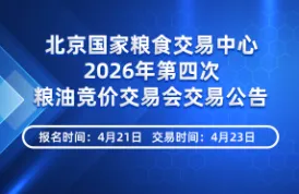 北京国家粮食交易中心(以下简称交易中心)根据北京市粮食和物资储备局下达的轮换计划,接受北京市燕谷粮油购销有限责任公司(以下简称燕谷公司)的委托,定于2026年4月23日9:30在交易中心采用国家粮食交易平台,举办“2026年北京市储备粮油第四次竞价交易会”。现将有关事项公告如下: