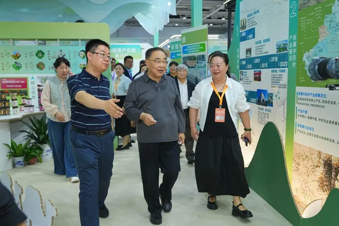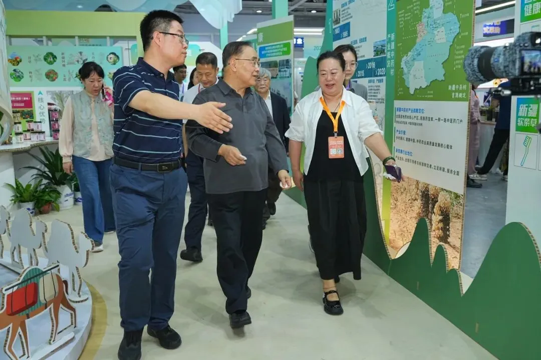 并介绍到本次特装展,公司以一带一路发展理念为核心设计思路,深度融入天山风貌、新疆民族传统纹样等地域文化元素,打造出兼具地域特色与产业内涵的沉浸式中医药产业会客厅。张伯礼院士重点查看了公司“疆十味” 道地药材标本、GAP种植基地等建设成果,对企业立足新疆资源优势、深耕道地药材开发与标准化种植的长期实践给予高度认可。