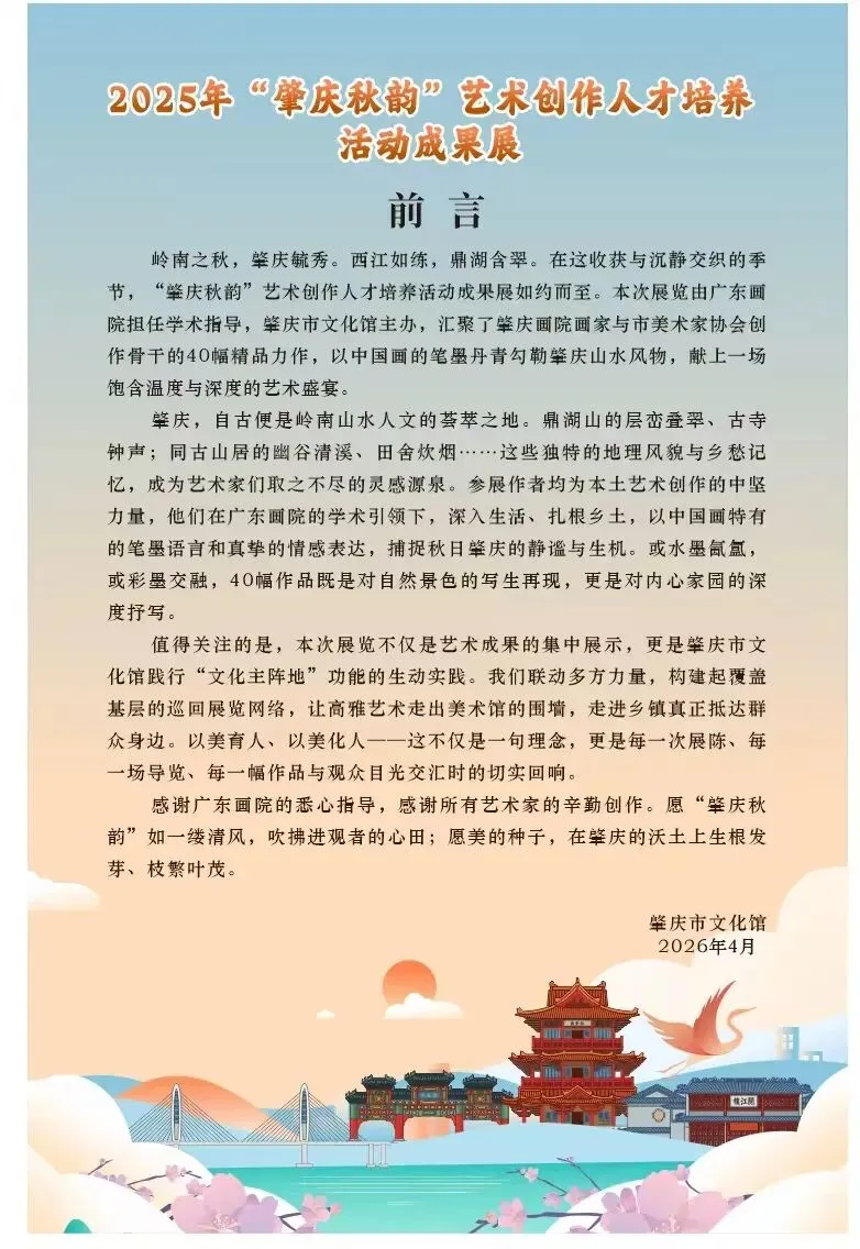 由广东画院担任学术指导、肇庆市文化馆(肇庆画院)主办的 “肇庆秋韵”艺术创作人才培养活动成果展,将于2026年4月18日在肇庆市文化馆正式拉开帷幕,展览持续至5月20日。