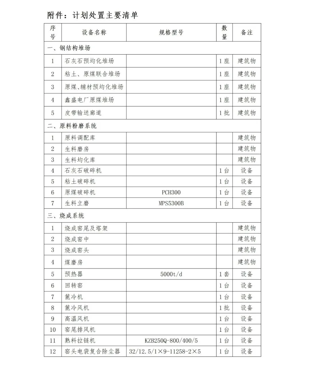 梅州市塔牌集团蕉岭鑫达旋窑水泥有限公司位于梅州市蕉岭县文福镇,具有一条完整的5000t/d新型干法旋窑水泥熟料生产线和配套余热发电系统(原鑫盛电厂)。现拟对该公司熟料生产线进行处置,主要资产清单详见文后附件。处置事宜的招标工作最终须由该公司按照法律程序要求、依规实施。