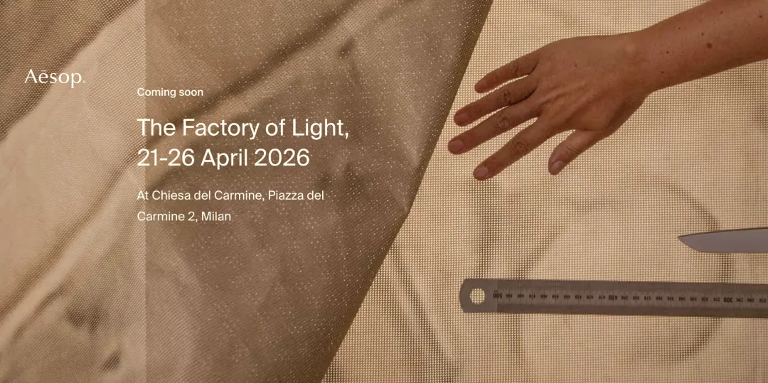 今年米兰设计周,Aesop 带来沉浸式装置 “The Factory of Light”,由澳大利亚建筑师 Rodney Eggleston(March 工作室创始人)设计,探索建筑、光线与工艺的融合。