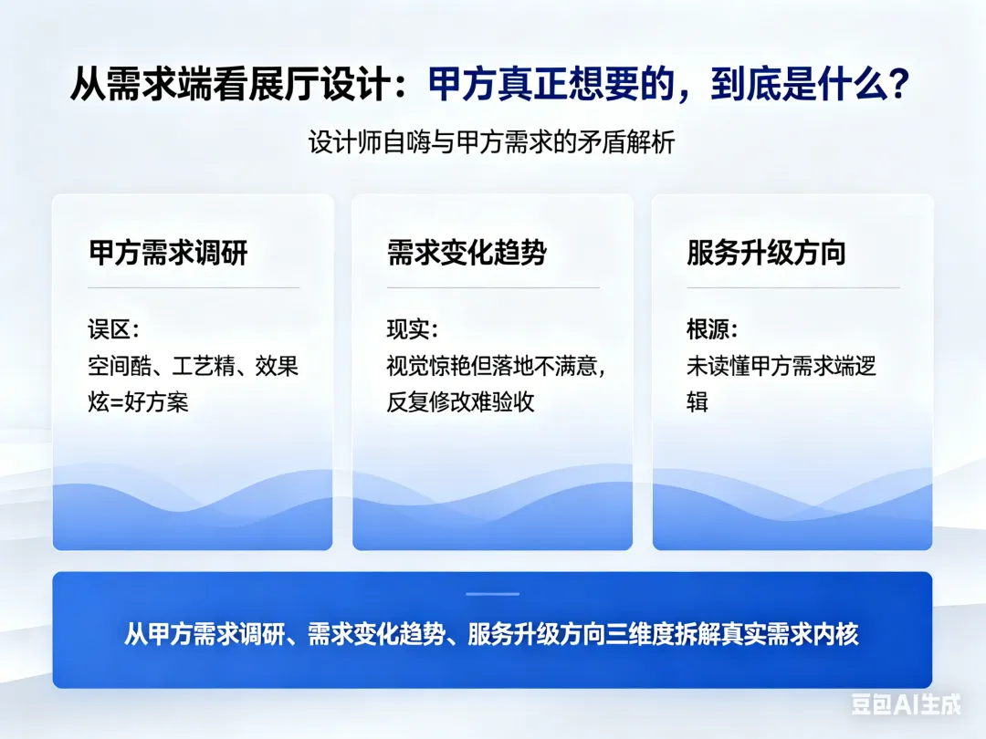 在展厅设计行业,设计师常常陷入一个误区:把空间做酷、把工艺做精、把效果做炫,就等于交出了一份好方案。但现实是,很多视觉惊艳的展厅,落地后甲方并不满意,甚至反复修改、难以验收。
