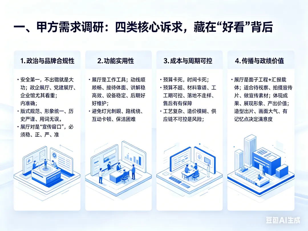 展厅设计的本质,从来不是美学竞赛,而是需求解决方案。甲方真正想要的,从来不是最炫的设计,而是:不出错、能落地、控成本、好接待、易传播、可迭代。