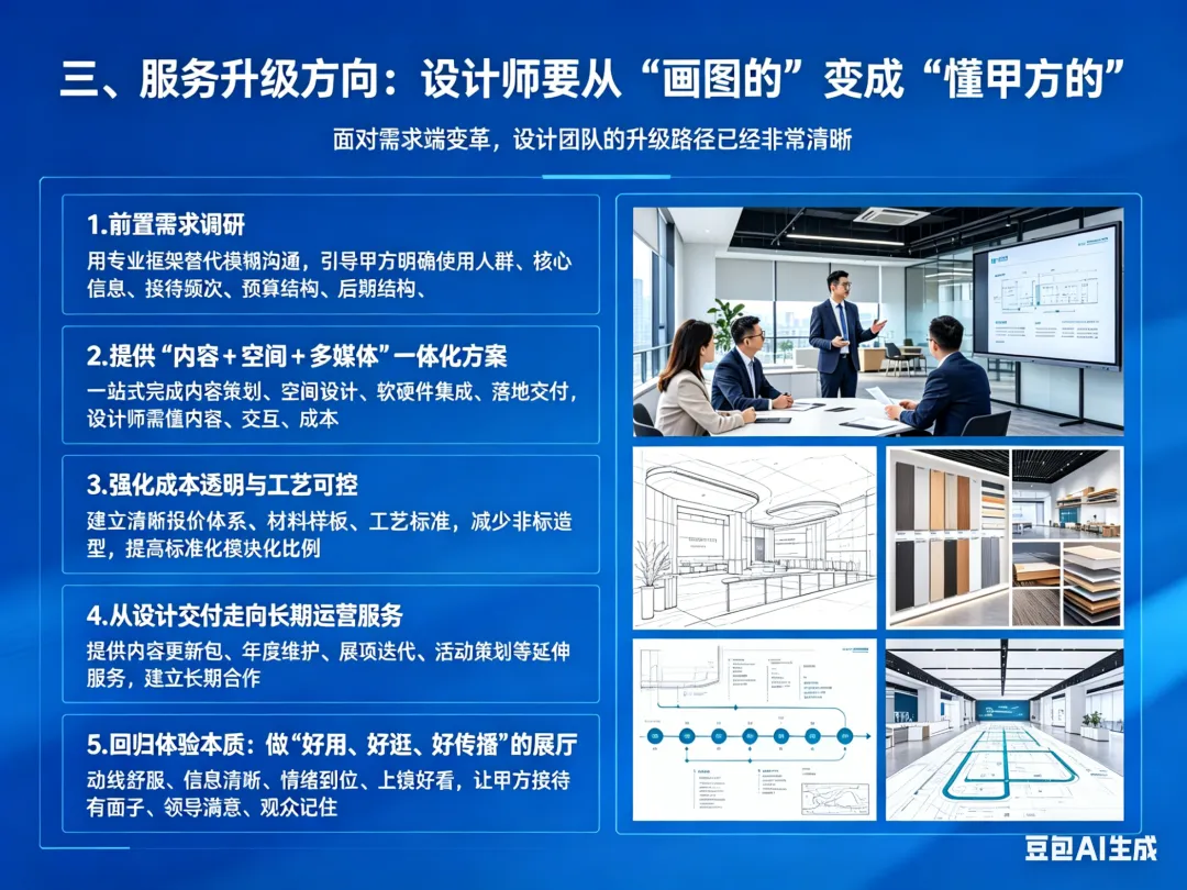 甲方最怕多方协调、责任不清。能一站式完成内容策划、空间设计、软硬件集成、落地交付的团队,将拥有绝对优势。设计师必须懂内容、懂交互、懂成本,才能真正解决甲方痛点。