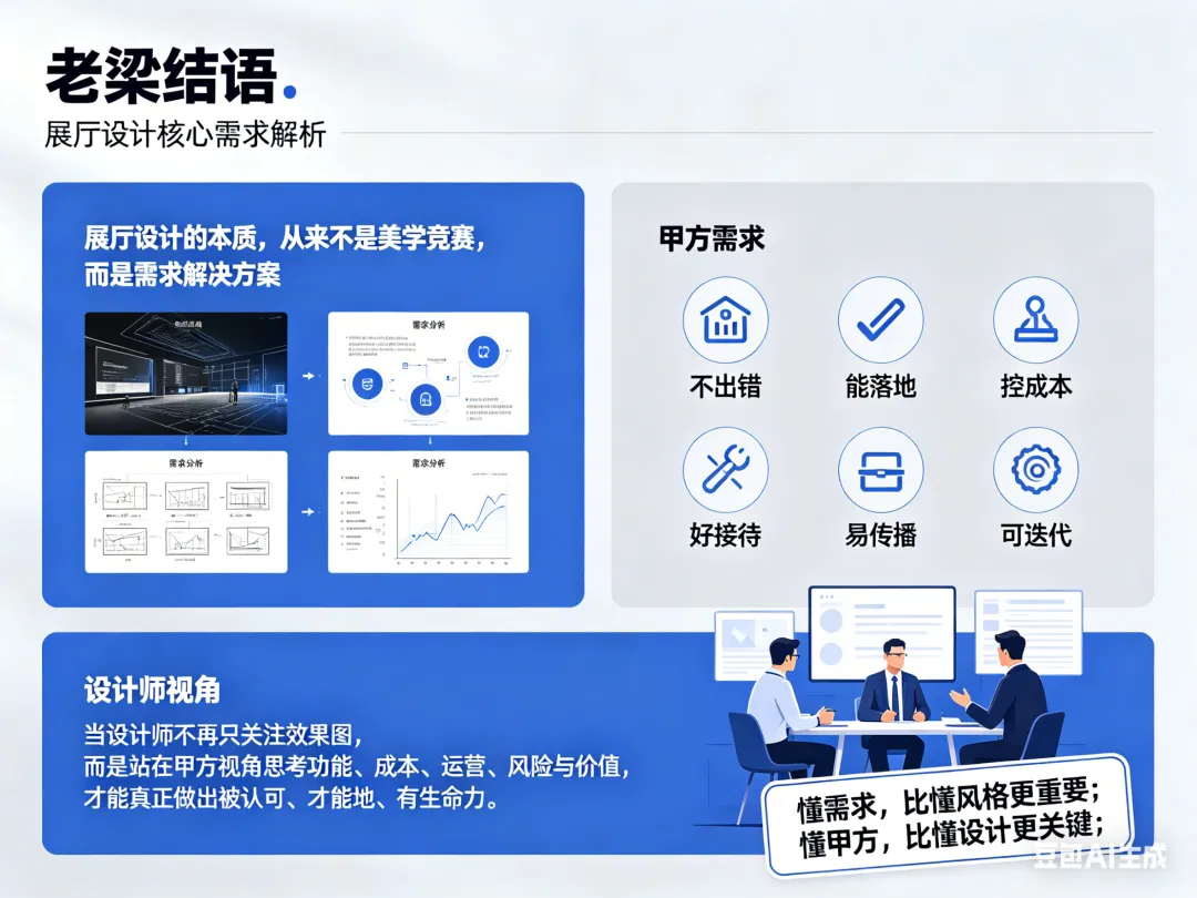 当设计师不再只关注效果图,而是站在甲方视角思考功能、成本、运营、风险与价值,才能真正做出被认可、能落地、有生命力的展厅。