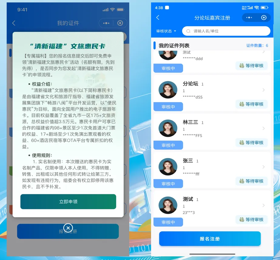 立足峰会宣传窗口作用,创新推出“清新福建”文旅惠民卡专属服务,面向外省参会嘉宾限量发放。惠民卡整合全省九市 175 项以上文旅资源,总权益价值超 3.5 万元,涵盖 98 家以上景区免首道门票、17 家以上剧场免演出票、60 家以上酒店民宿专属折扣等权益,将峰会服务与福建文旅推广深度结合,以数字化手段传递福建温情,展现“清新福建”独特魅力,实现会务服务与地方文旅宣传双向赋能。