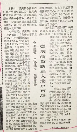 经过两个多月整顿和不懈努力,崇庆酒香又飘四方。早在中秋国庆来临之前的七八月份,来函来电要求订货的越来越多,恢复了一度中断的购销关系,产品重新进入北京、河南、陕西等十多个省(自治区、直辖市),社办酒厂除巩固了老客户外,还新开辟了20多个销售网点。全县更一改过去酒产品闯北不走南的状况,进入了上海、广东等地的市场。