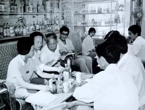 1983年夏,省外酒商在崇庆县糖酒公司洽谈业务。