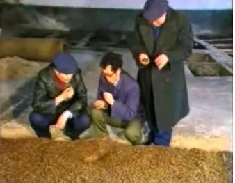 1987年冬,白酒泰斗曾祖训(左一)在国营崇庆县酒厂车间进行实地调查。