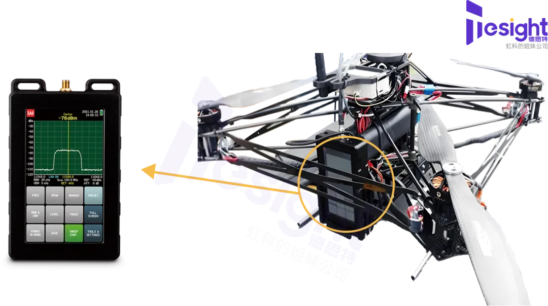 德思特无人机机载频谱监测方案以德思特手持式频谱分析仪与实时频谱分析仪为核心设备,具备宽频率覆盖、高灵敏度、灵活数据传输等特点,配合定向天线,可实现对复杂电磁环境的精准监测。助力行业用户突破空中频谱监测极限,构筑坚实的低空信号安全防线。