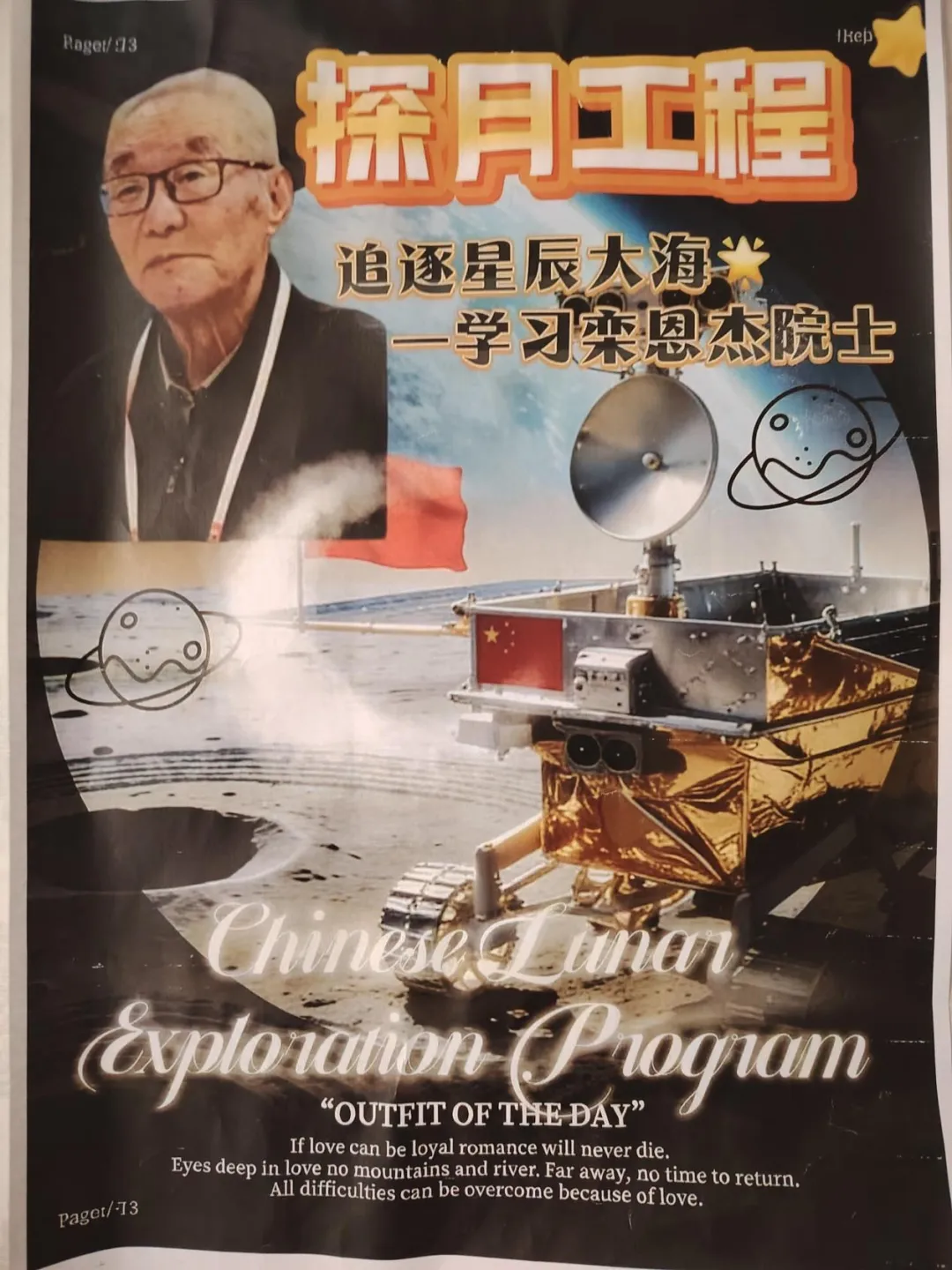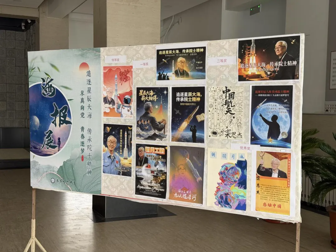 本次主题海报征集活动作为学校系列主题教育活动的重要环节,严格依照活动方案要求开展,面向高一、高二年级学生广泛征集作品。活动中,同学们充分发挥艺术创造力与想象力,紧扣活动核心主题,将栾恩杰院士爱国奉献、严谨求实、攻坚克难的精神品质,与航天索、星辰大海、青春逐梦等元素深度融合,精心构思、用心创作。一幅幅海报作品构图新颖、色彩鲜明、主题突出,既融入了探月工程、航天飞行器等特色元素,又以凝练的文字传递出对国之栋梁的崇高敬意,生动展现了齐中学子崇尚科学、追求卓越、立志报国的青春风貌,让院士精神以可视化、艺术化的形式浸润校园每个角落。