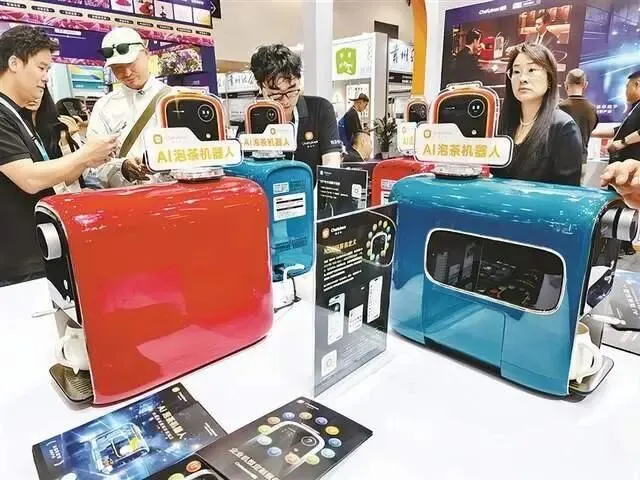 “茶小牛科技”携全球首款AI泡茶机器人惊艳亮相,凭借“AI复刻盖碗非遗技艺”的创新体验,让企业展位成为全场人气最高的展位之一。“这台机器人泡的茶,汤色、香气、口感都不比茶艺师手工泡的差!”该公司总经理助理陈常淼言语中满是自豪,“这款AI泡茶机器人搭载多模态传感系统与仿生机械臂,通过百万次动作学习,可精准复刻盖碗冲泡核心手法,做到水温、水流力度、出汤速度等‘一茶一参数’精准匹配,让机器泡出的600多种茶‘形神兼备’。”