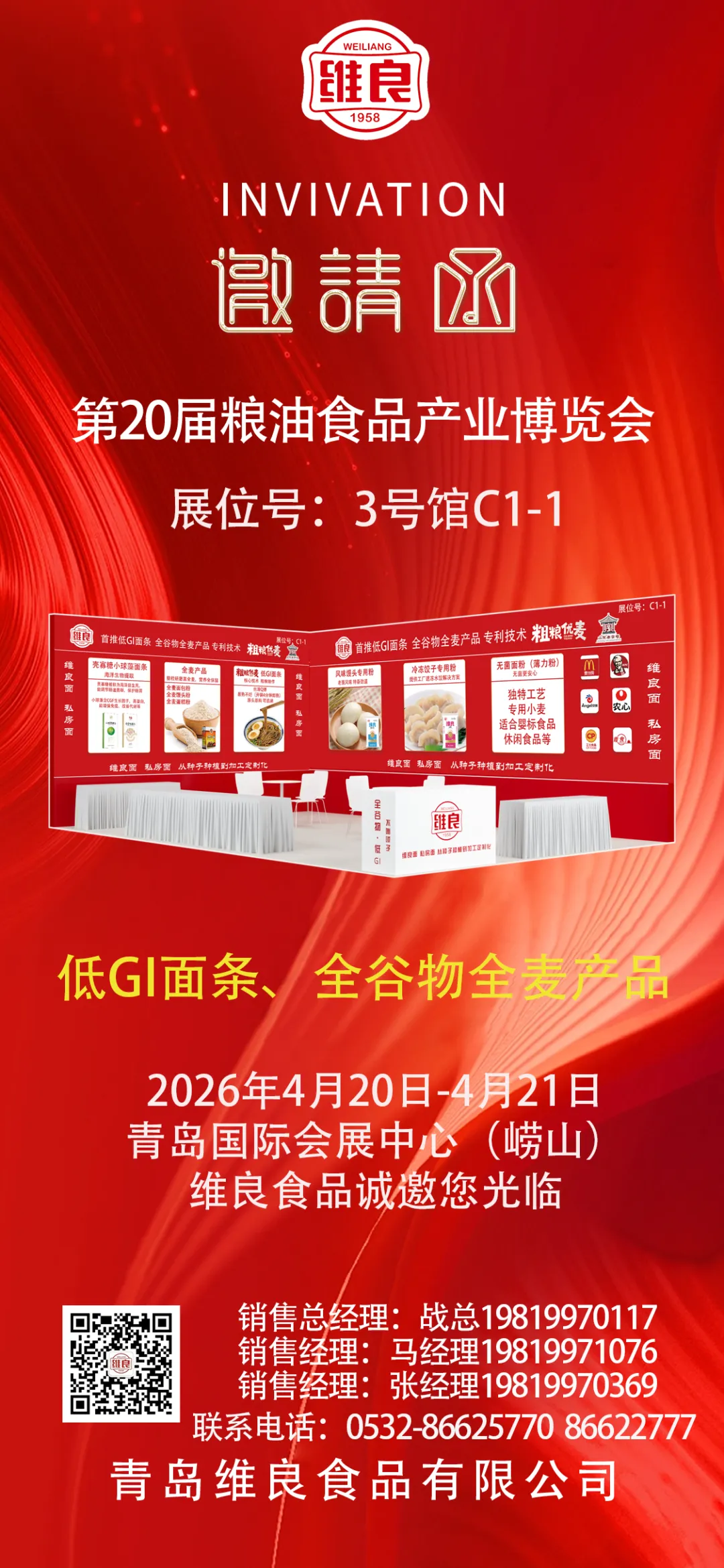 第二十届粮油食品产业博览会将于4月20日-21日在青岛国际会展中心盛大举办。维良食品重磅亮相,携低GI食品、冷冻水饺粉、风味馒头粉、无菌薄力粉、养生面条等核心新品参展,现场开放招商席位,诚邀全国经销商、采购商莅临展位,共探粮油新机遇!