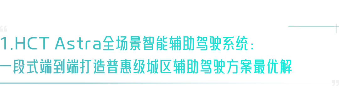 HCT Astra全场景辅助驾驶系统是基于地平线征程6M(J6M)芯片,专为用户智能出行需求打造的全场景辅助驾驶产品。该产品不依赖高精地图,可拓展实现全场景辅助驾驶功能,包括城区NOA、高速NOA、记忆泊车HPA以及智能泊车APA等,一段式端到端算法将系统时延降低至200ms以内,点重刹、画龙等不良驾驶表现减少90%,能够带来更连贯丝滑、“拟人感”的驾驶体验。