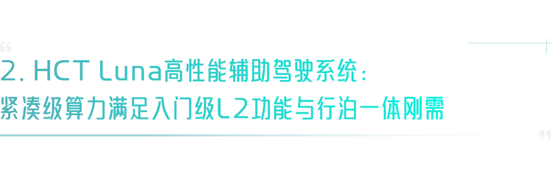 其中,HCT Luna高性能前视一体机专为量产标配打造,支持更强更全面的主动安全功能,并提供舒适与拟人化的行车体验。HCT Luna行泊一体入门级辅助驾驶系统基于单颗J6B芯片,覆盖从行车到泊车的主要场景需求,如高速NOA、集成式巡航辅助ICA、智能泊车APA、遥控泊车RPA等,满足全球各个国家市场的法规及安全标准,推动极具性价比的行泊一体方案量产落地,引领辅助驾驶标配普及。