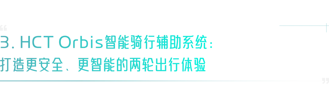 HCT Orbis是一套专为骑行打造的智能辅助系统,将汽车级别的智能辅助驾驶能力迁移至两轮出行场景。通过智能摄像头与多维度感知模型,系统能够实时识别道路中的车辆、行人、车道线、交通标识及红绿灯等,提前预判潜在风险,辅助骑手从容应对复杂路况,实现更安全、更智能的骑行体验,同时可针对不同国家地区交通场景与法规差异,精准定制方案,守护全球每一位骑手。