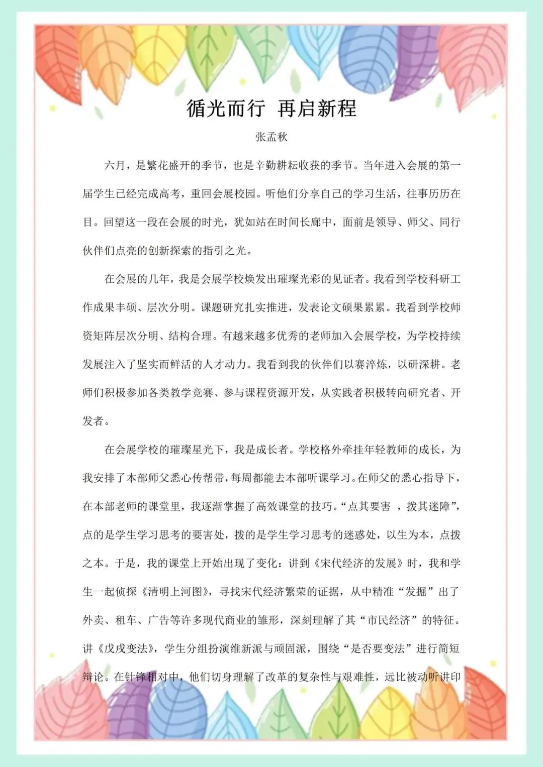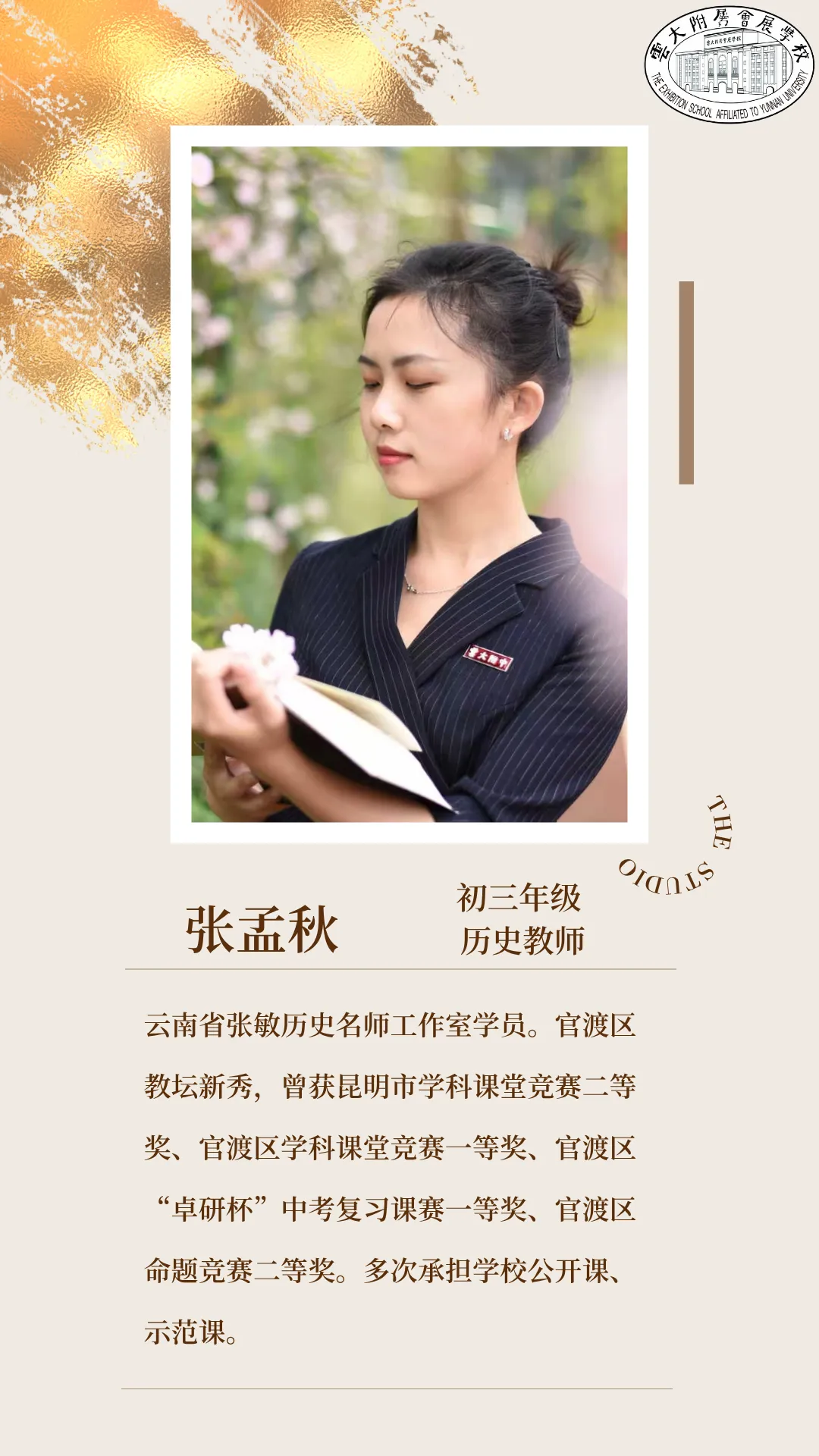 作为一名历史教师,张孟秋在师父的引领下,把课堂变成了探索的旅程。她带学生“侦探”《清明上河图》,寻找外卖、租车、广告的雏形;她组织维新派与顽固派的课堂辩论,让孩子在针锋相对中理解改革的复杂。有学生告诉她:“每周最期待的就是历史课。”从“学习者”到“思考者”,张老师用创新与深耕,让历史的深度与教育的亮度交相辉映。她说,祝每个孩子都成为“光”的承载者与传递者。