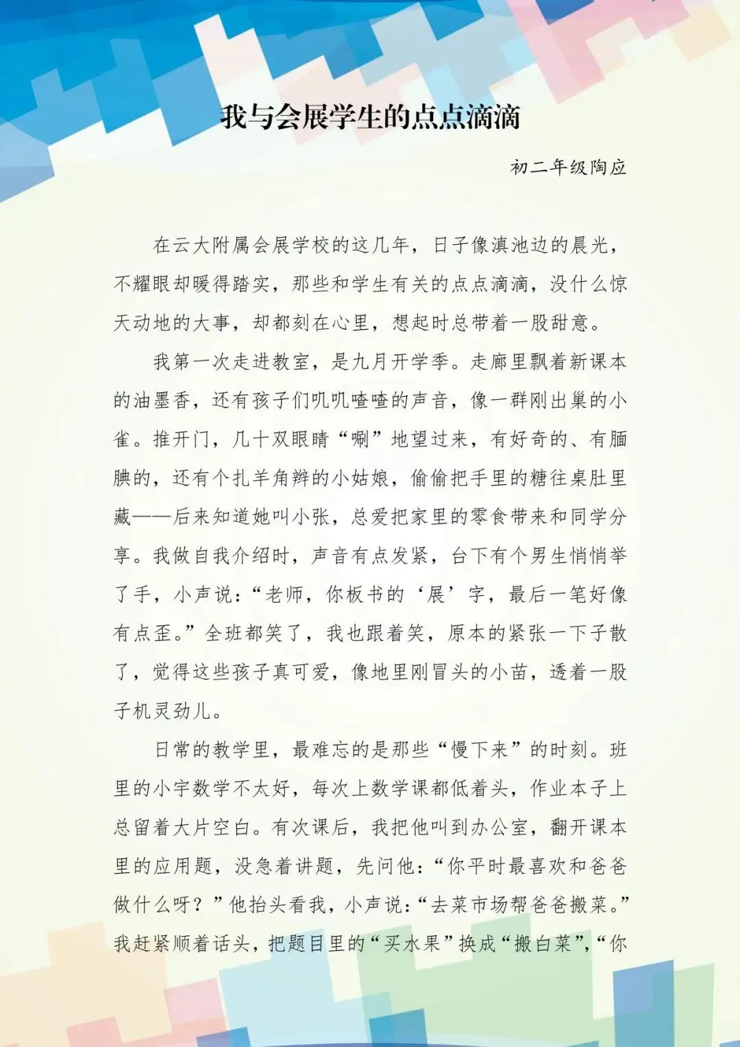 在云大附属会展学校,每一天都有温暖的故事悄然发生。老师们把耐心揉进粉笔灰里,把爱意藏进课桌的边角,用最朴素的方式,守护着每一个孩子的成长。今天,让我们走近三位老师——张孟秋、陶应和杨晓敏三位老师,聆听他们与学生之间的动人片段,感受那份以心传心、以爱育爱的师者风范。