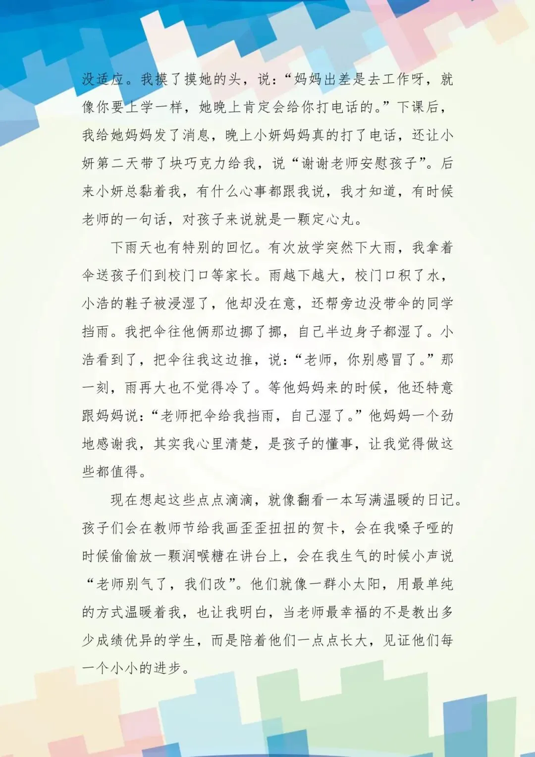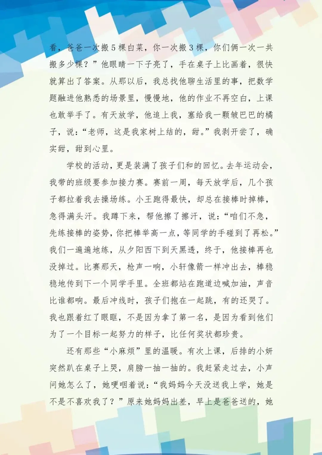 在陶应老师的记忆里,孩子们是“地里刚冒头的小苗”。他从不急着灌输公式,而是把应用题换成学生熟悉的场景——“搬白菜”代替“买水果”,让害怕数学的孩子眼睛一亮;他会在孩子哭着想妈妈时轻轻抚慰,会在雨天把伞偏向学生,自己淋湿半身。那些塞来的皱橘子、悄悄放在讲台上的润喉糖、歪歪扭扭的教师节贺卡,都是师生之间最朴素的情书。陶老师说,当老师最幸福的不是学生成绩多好,而是陪着孩子一点点长大,见证每一个小小的进步。
