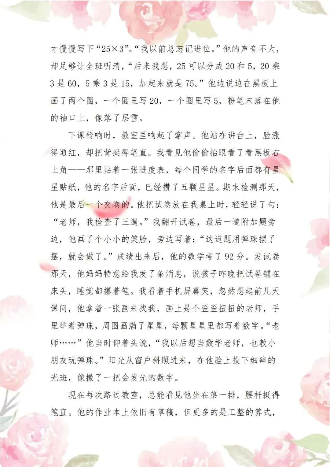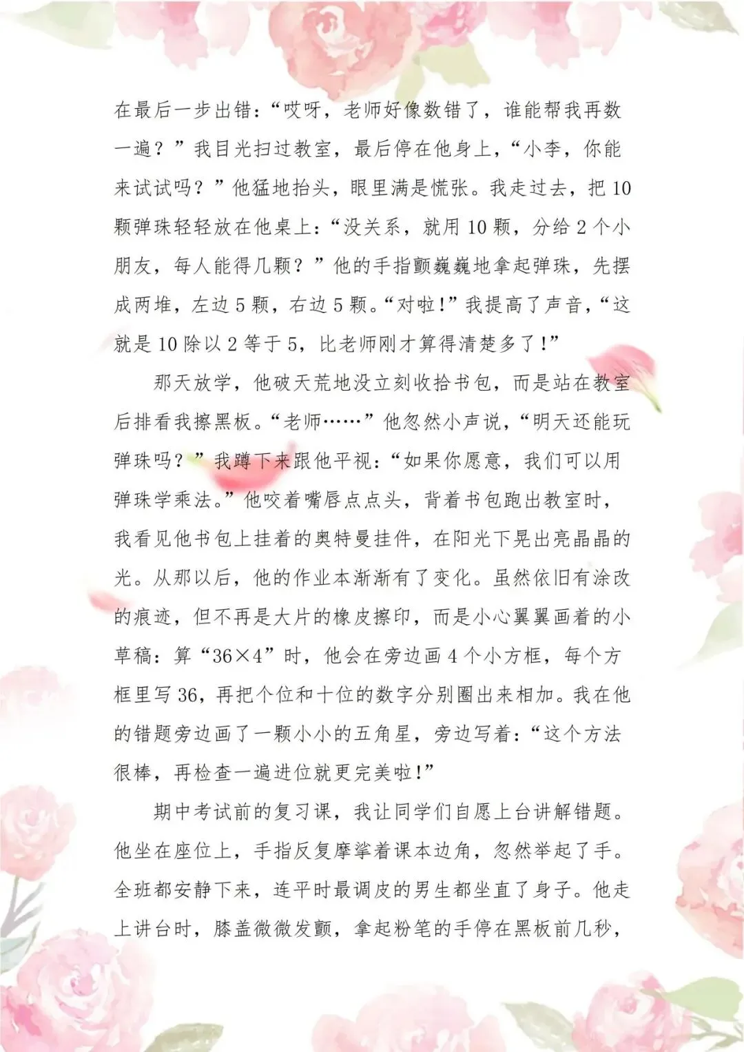 面对转学后因数学成绩落后而恐惧数字的小李,杨晓敏老师没有急于讲题,而是用一盒玻璃弹珠搭起了信心的阶梯。她把乘法变成“分糖果”游戏,把进位拆解成小方框里的圈画,让孩子在摆弄弹珠中悄然理解了算理。当小李第一次鼓起勇气走上讲台讲解错题,当他的作业本上终于出现工整的草稿和五角星,我们知道:教育不是填满桶,而是点燃火。期末92分的试卷旁,那个画着笑脸的附加题,成了童年最闪亮的勋章。