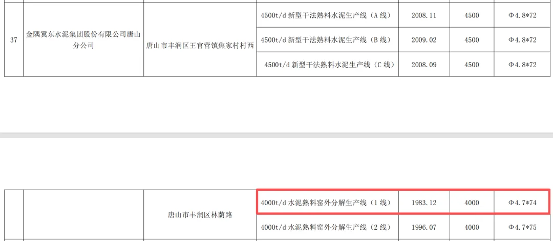 清单中投产时间最早的生产线为金隅冀东水泥股份有限公司唐山分公司的“4000t/d水泥熟料窑外分解生产线(1线)”,投产于1983年12月,截至2025年底,该生产线已连续运行42年。