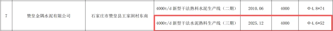 2.赞皇金隅水泥有限公司(石家庄市赞皇县):4000t/d新型干法水泥熟料生产线(三期),投产时间2025年12月,窑规格Φ4.6×52。