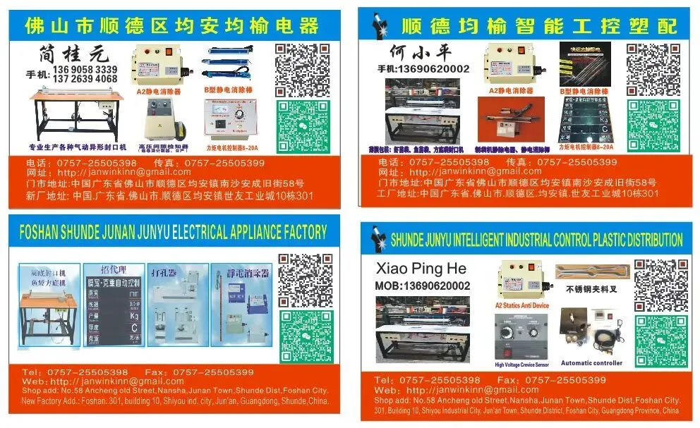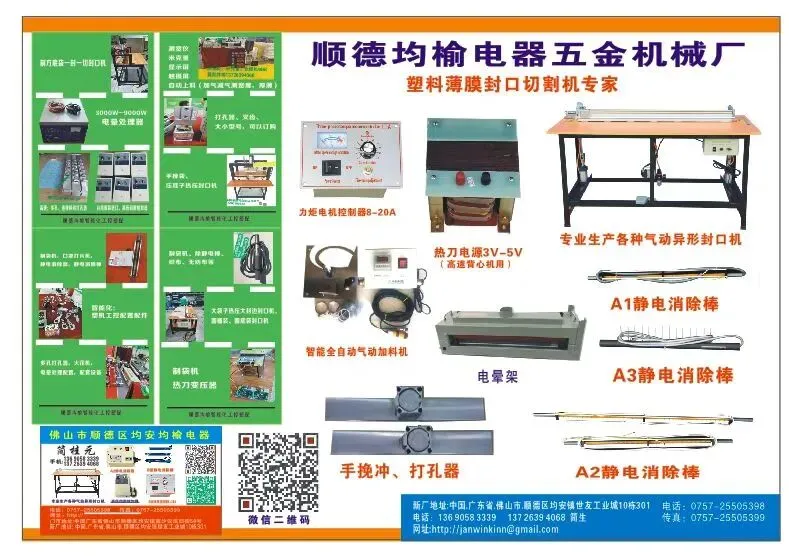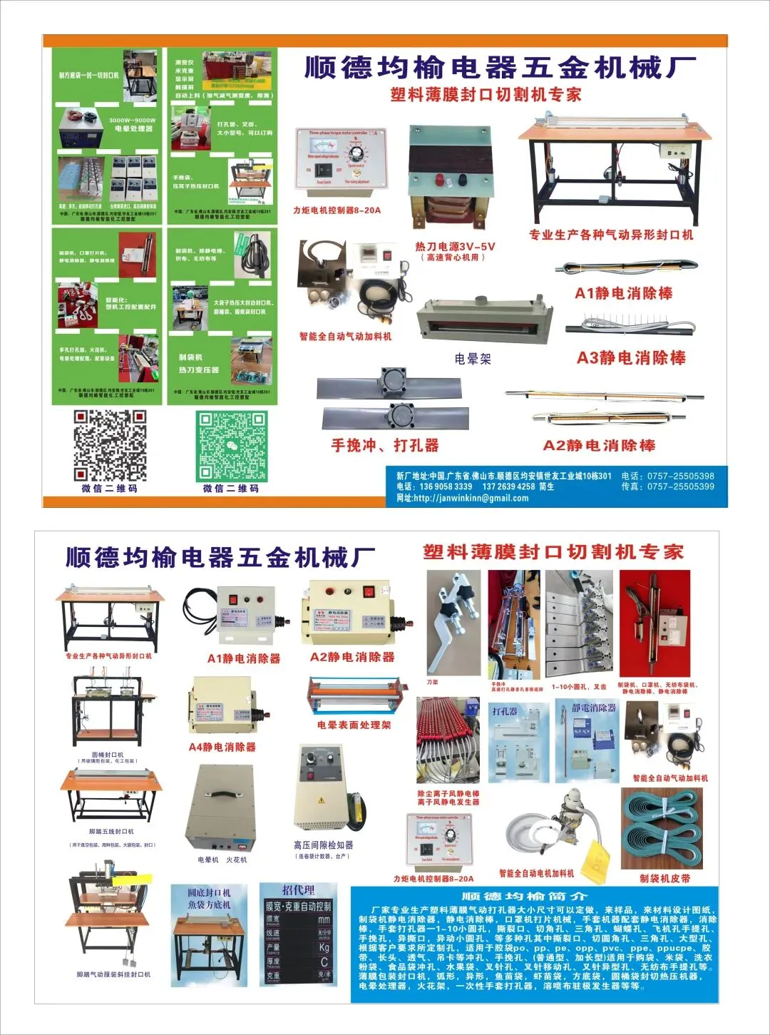 《顺德均榆》电器五金智能工控塑配,坐落于佛山市顺德区均安镇,是一家致力于,自主研发,公司团队合作精神。制造高品质塑料机械吹膜机械、三边封机械、印染机械设备等。周边配置配件,除尘离子风发生器、离子风除除尘消除棒,封口机、制袋机、静电消除器、静电消除棒、追色电眼、送料板、汽动高速打孔器,手挽孔冲子,大小冲孔打孔器等,专业生产产品的企业。我们秉承着低调务实的经营理念,以持续创新为管理理念,并以合理化、科学化、标准化、网络化的管理特色来确保卓越运营。