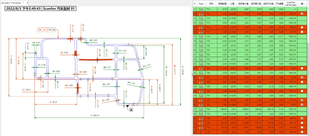 塑胶挤压订单常涉及多规格、多公差的客户图纸。ScanFex 3.5可一键导入CAD图纸,自动识别尺寸标注与公差范围(如±0.1mm),并匹配至对应测量轮廓。无需手动建立基准,大幅缩短新品首检准备时间,避免人为录入错误。