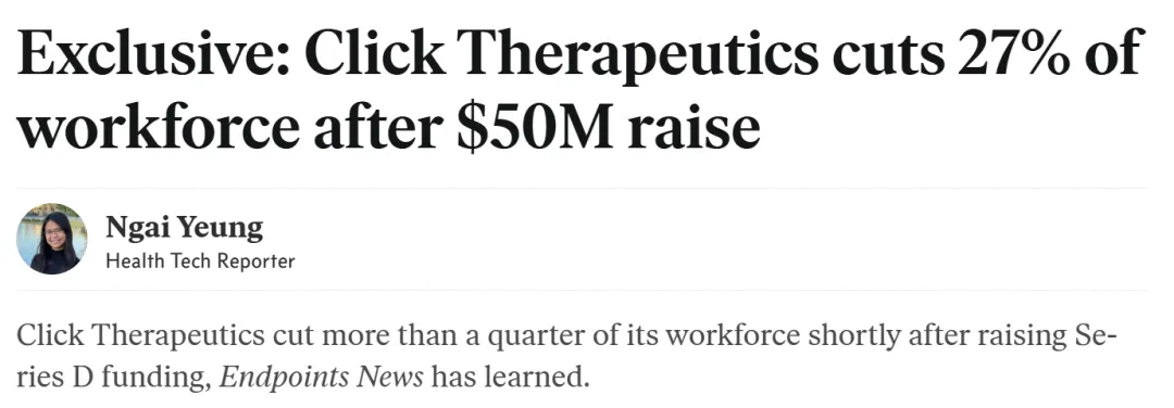 据行业权威媒体报道,就在宣布完成新一轮融资、并接手其在研数字疗法产品 CT-155 的商业化工作几天后,Click Therapeutics便裁减了超过四分之一的员工。