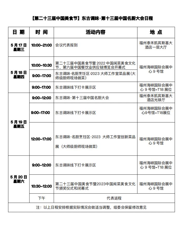 作为商务部2023年“中华美食荟”系列重点活动,第二十三届中国美食节暨2023中国闽菜美食文化节将于5月18至20日在福州市举办。活动以“守正创新、闽菜发展”为主题,由中国饭店协会主办,中国饭店协会餐饮业事业部、中国饭店协会会展部、福州市餐饮烹饪行业协会等承办,同期举办东古调味·第十三届中国名厨大会。