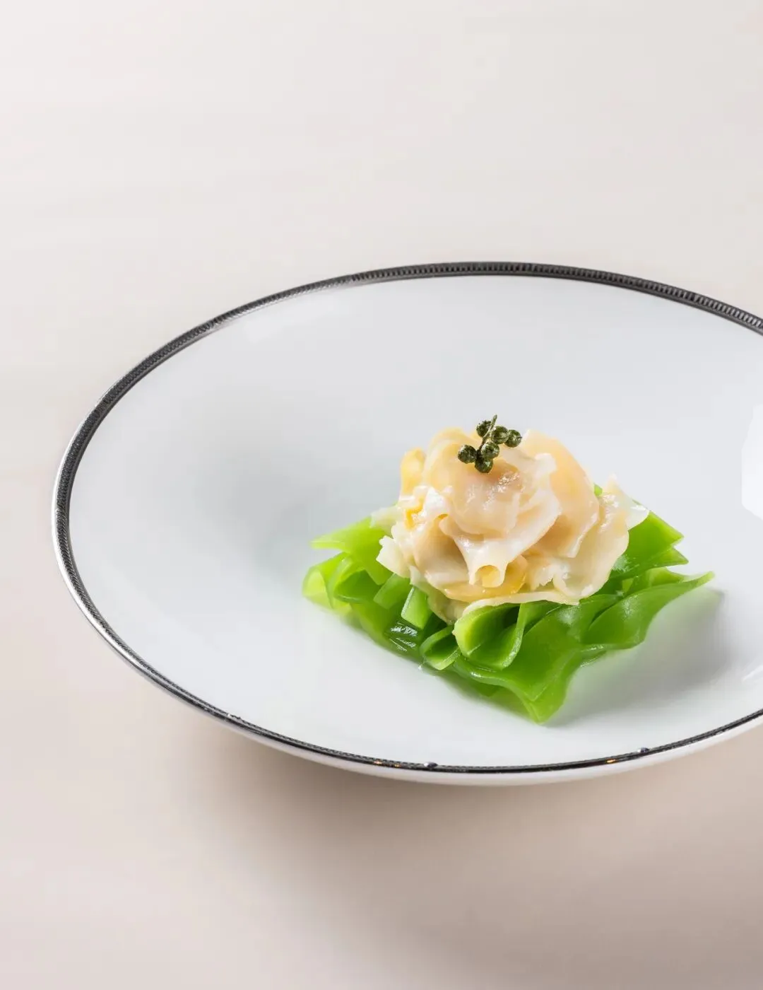 甄选大连獐子岛海螺,得益于纯净水域,肉质肥厚鲜甜、脆嫩爽口。搭配四川青笋,色泽清润、口感清甜。烹饪上遵循“大道至简”,海螺片经低温汆烫锁住本味,青笋薄切垫底保留天然脆感。最后淋以秘制椒麻汁,花椒的微酥与葱香的清爽交织,恰到好处地衬托出海螺的鲜甜与青笋的清脆,回归食材最本真的表达。