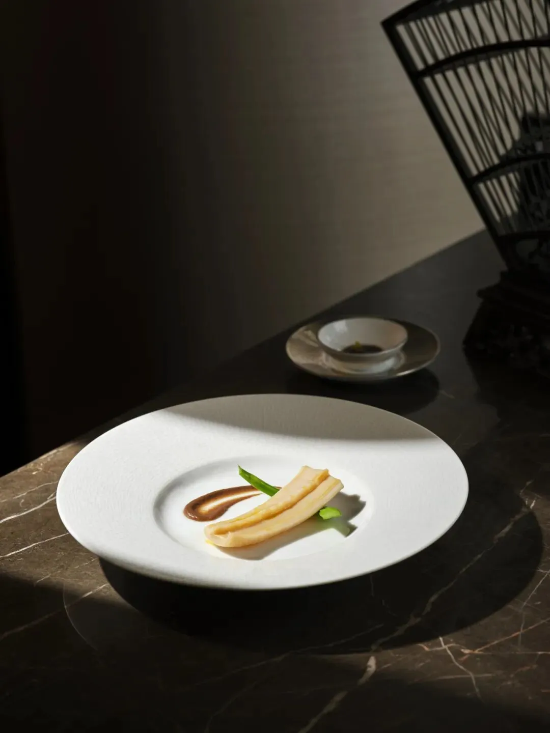 鸡汤秒灼厚切加拿大象拔蚌 甄选加拿大A级象拔蚌,于浓郁鸡汤中轻灼九秒,恰到好处地锁住其天然的海洋矿物鲜味与脆爽口感。佐以经典虾酱蘸汁,层层递进,将味觉体验推向更为丰富而悠长的境界。