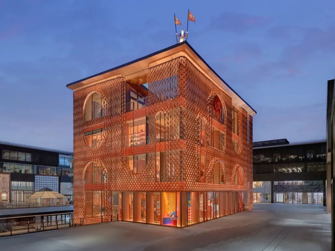 这座五层独立建筑跃然矗立,玻璃幕墙外覆以玫瑰粉与赤褐色瓷砖。由巴黎建筑事务所 RDAI与Mamou-Mani Architects合作设计的外立面宛若一层半透明纱幕,通过规律纹理在朦胧与通透间取得精妙平衡,令自然光线得以照亮室内。