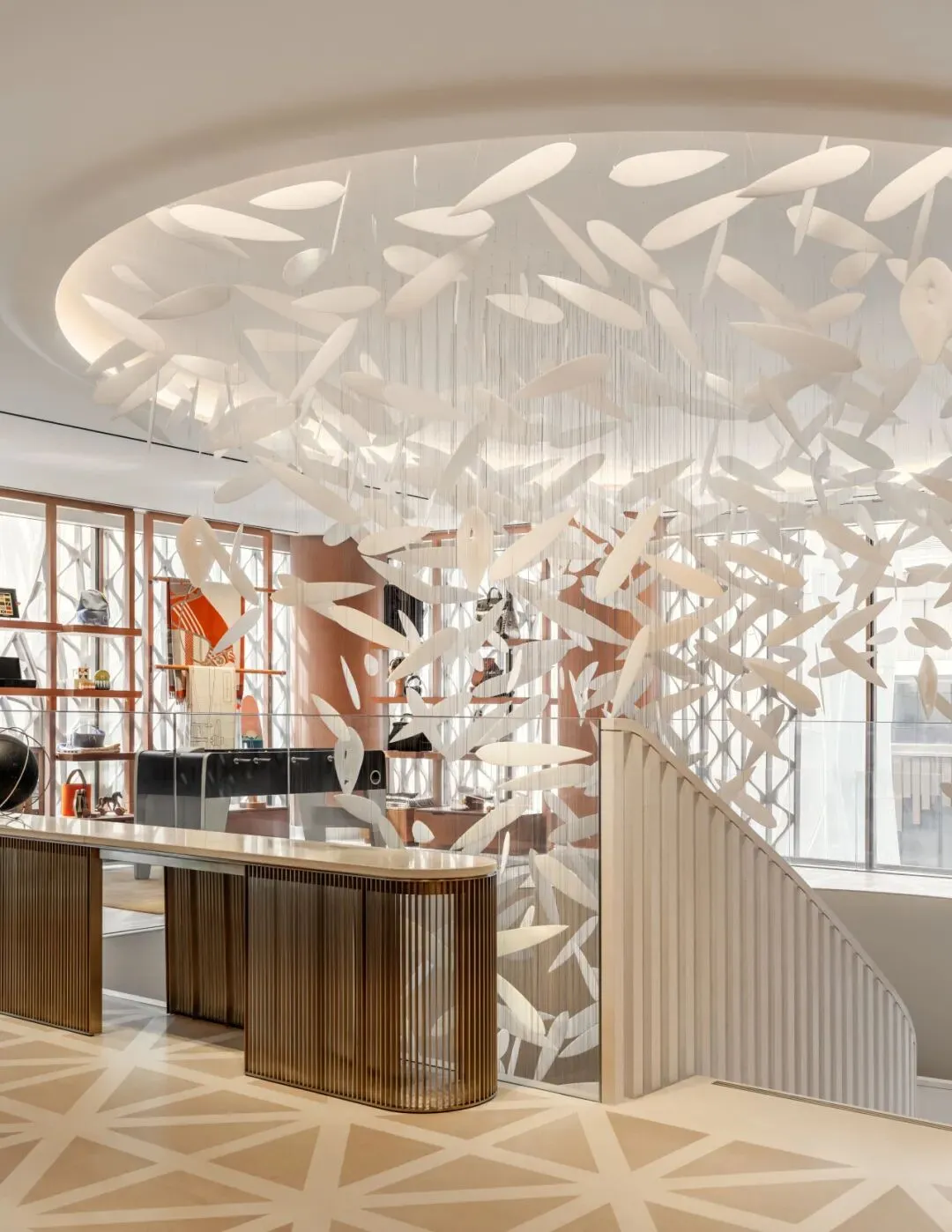一系列甄选艺术品丰富空间设计,其中包括现代艺术作品、数件来自埃米尔•爱马仕(Émile Hermès)珍藏馆的艺术品以及爱马仕当代摄影收藏作品。中国艺术家刘建华受邀创作的艺术品:以手工陶瓷花瓣与大理石饰片特别创作的悬浮装置,自楼梯顶端垂落,仿佛凌空轻悬,让人联想到骑士挥鞭时的流畅弧线。