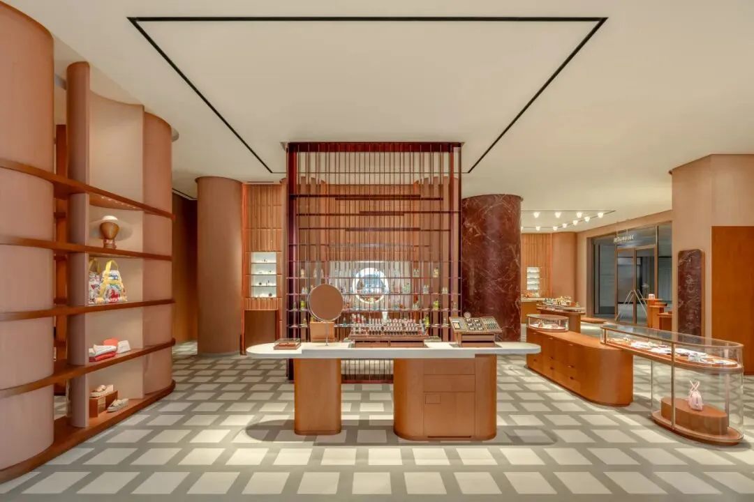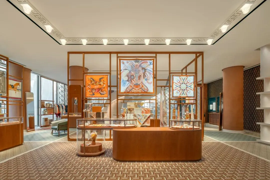 室内空间布局开阔,其间设计纹样承袭跃动于立面的拱形与织纹图案,中央一座宏伟石质楼梯盘旋而上。地下一层设有两处入口,以爱马仕标志性藏书章装点,自然开启探访之旅:鞋履与丝织品区域率先映入眼帘,其后则构筑出开阔的香水与美妆区域。