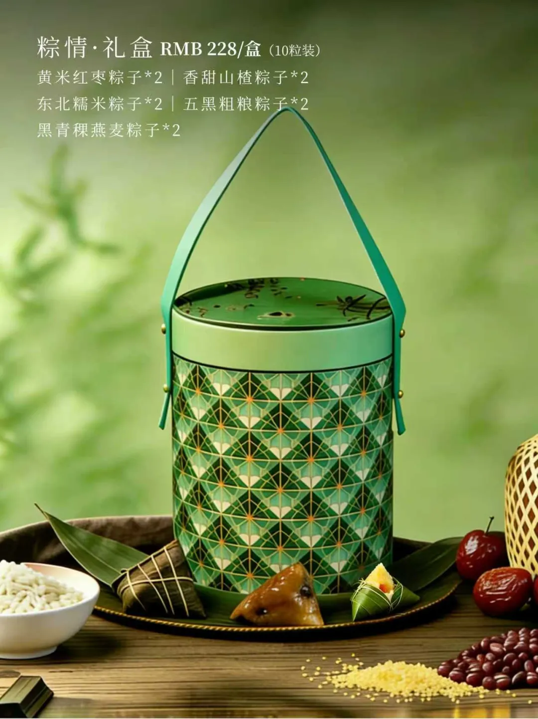 方形「粽逸礼盒」取“方正沉稳”之韵,菱格纹肌理勾勒精致质感,清新绿配色尽显雅致格调。礼盒阵容全面升级,囊括蛋黄鲜肉、高汤笋丁、黑松露三菇等风味粽,搭配流油海鸭蛋、血糯米、糙米等时令食材,豪华配置满足多元味蕾需求,是商务往来中体面且走心的礼赠之选!!