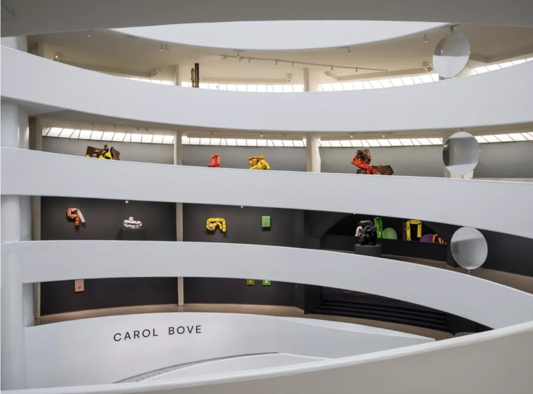 ■ Installation view, Carol Bove, Solomon R. Guggenheim Museum, New York, March 5–August 2, 2026. Artwork © Carol Bove Studio LLC. Photo: David Heald © Solomon R. Guggenheim Foundation, New York本次展览是Carol Bove迄今为止规模最大、亦是首个博物馆级回顾展,从早期绘画到近期以废金属与钢管构成的大型“拼贴雕塑(collage sculptures)”,此次展出系统梳理了其长达二十五年的创作历程及其中的多次重要转折。同时,Bove通过一系列空间设计介入,对Frank Lloyd Wright(弗兰克·劳埃德·赖特,1867-1959)标志性的圆形展厅进行微妙调整,回应其长期关注的议题:物体与图像如何在不同环境中被重新定义。Marcel Duchamp(马赛尔·杜尚)