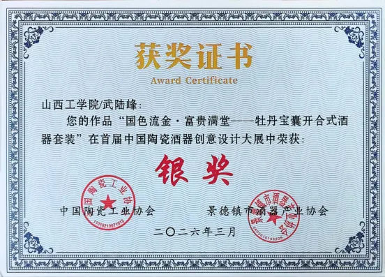 近日,由中国陶瓷工业协会主办的首届中国陶瓷酒器创意设计大展圆满落幕。我院教师武陆峰凭借作品《国色流金・富贵满堂——牡丹宝囊开合式酒器套装》荣获国家级银奖。这是我院首次在国家级陶瓷设计类赛事中取得重要突破,充分彰显了我院在陶瓷文化产业研究与设计创作领域的综合实力。