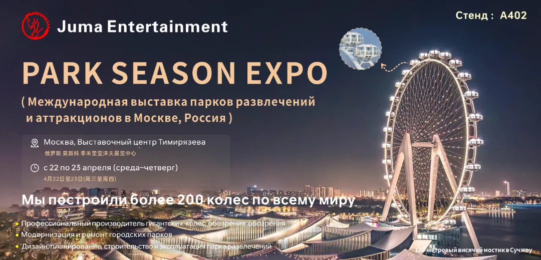 2026年4月22日-23日,俄罗斯莫斯科国际公园娱乐及游乐设施展览会PARK SEASON EXPO将在季米里亚泽夫展览中心(Timiryazev Center)盛大举行。巨马诚邀您莅临我们的展位——A402,届时将展出热门游乐设施与公园解决方案,与您共探行业趋势,开拓合作新机遇!期待在莫斯科与您相见!