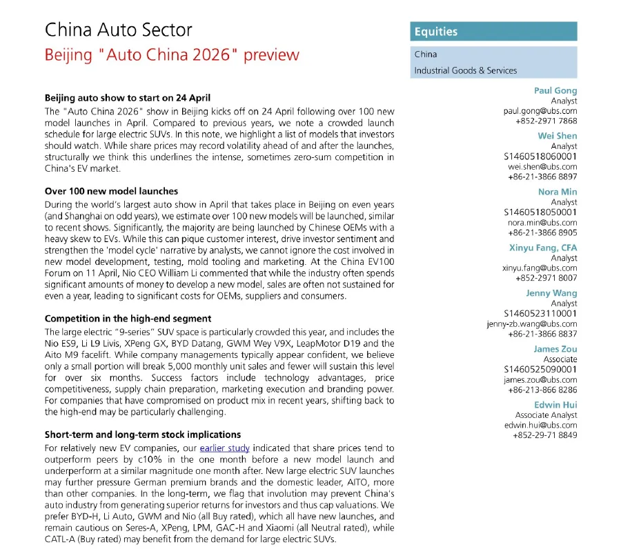 瑞银对即将于 4 月 24 日开幕的 2026 北京国际汽车展览会 (“北京车展”) 进行了前瞻性分析。报告认为,本届车展将有超过 100 款新车型发布,其中大型电动 SUV (“9 系列”) 细分市场竞争尤为激烈。尽管新车发布可能带来短期股价波动,但这也凸显了中国电动车市场竞争的激烈程度,甚至是零和博弈的性质。
